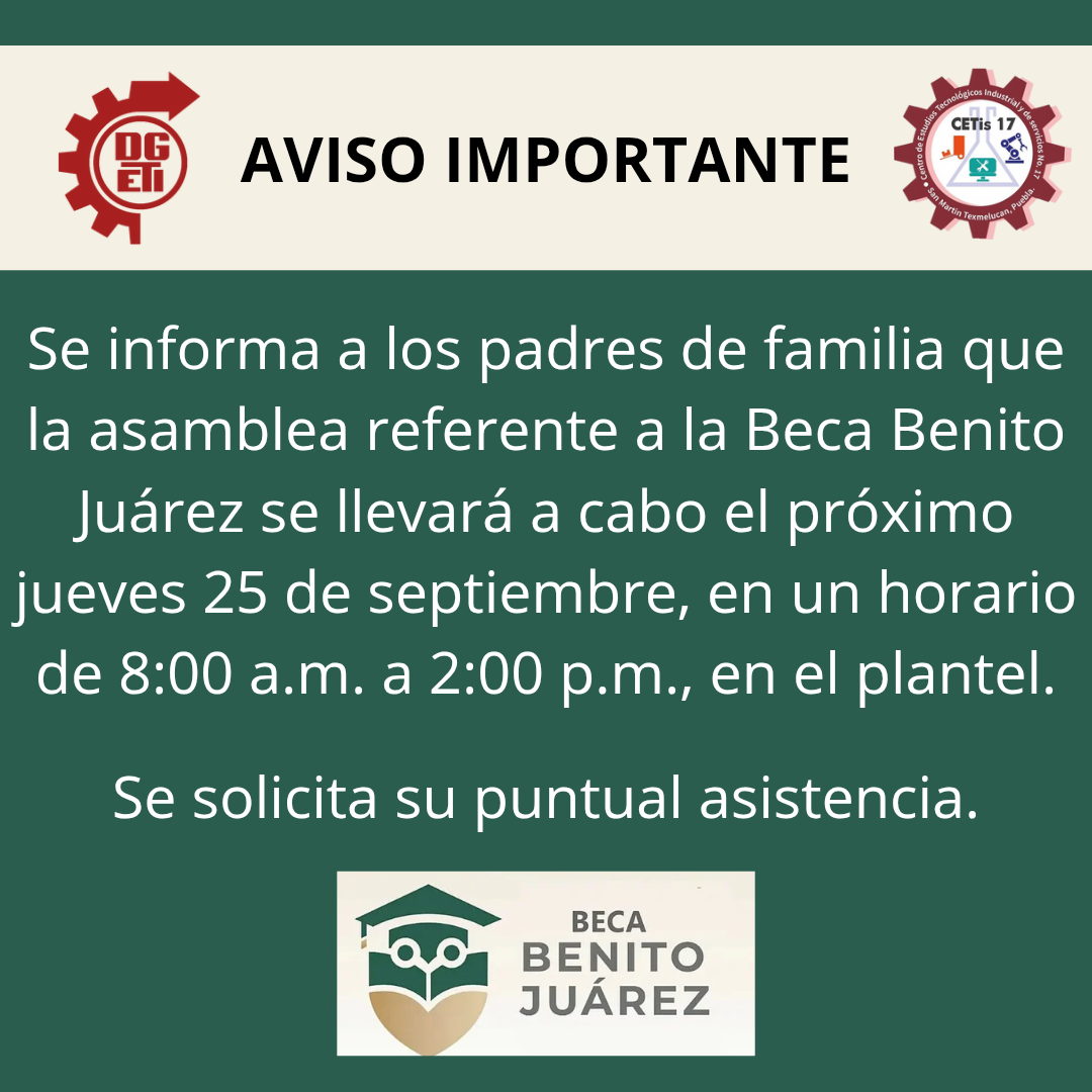Se informa a los padres de familia de 1er semestre, y de alumnos que aún no sean beneficiarios, que la asamblea referente a la Beca Benito Juárez se llevará a cabo el próximo jueves 25 de septiembre, en un horario de 8:00 a.m. a 2:00 p.m., en el plantel.